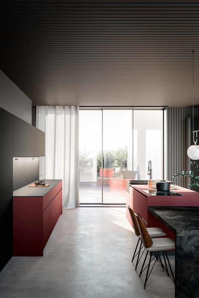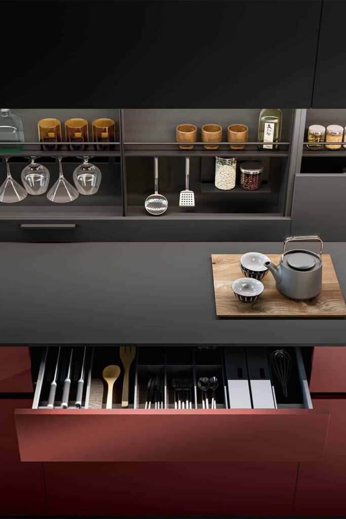 Des lignes sobres dessinent des surfaces épurées qui fusionnent harmonieusement style, prestige et fonctionnalité, trouvant un terrain d’entente entre l’innovation des matériaux et la qualité artisanale du Made in Italy. Les portes en stratifié offrent une résistance maximum à l’utilisation dans l’ambiance cuisine et créent des atmosphères singulières grâce aux différentes finitions, de brillantes à mates, et aux reproductions fidèles de pierres et de bois. Des solutions qui caractérisent la cuisine avec élégance et prestige, en l’interprétant pour des ambiances modernes.